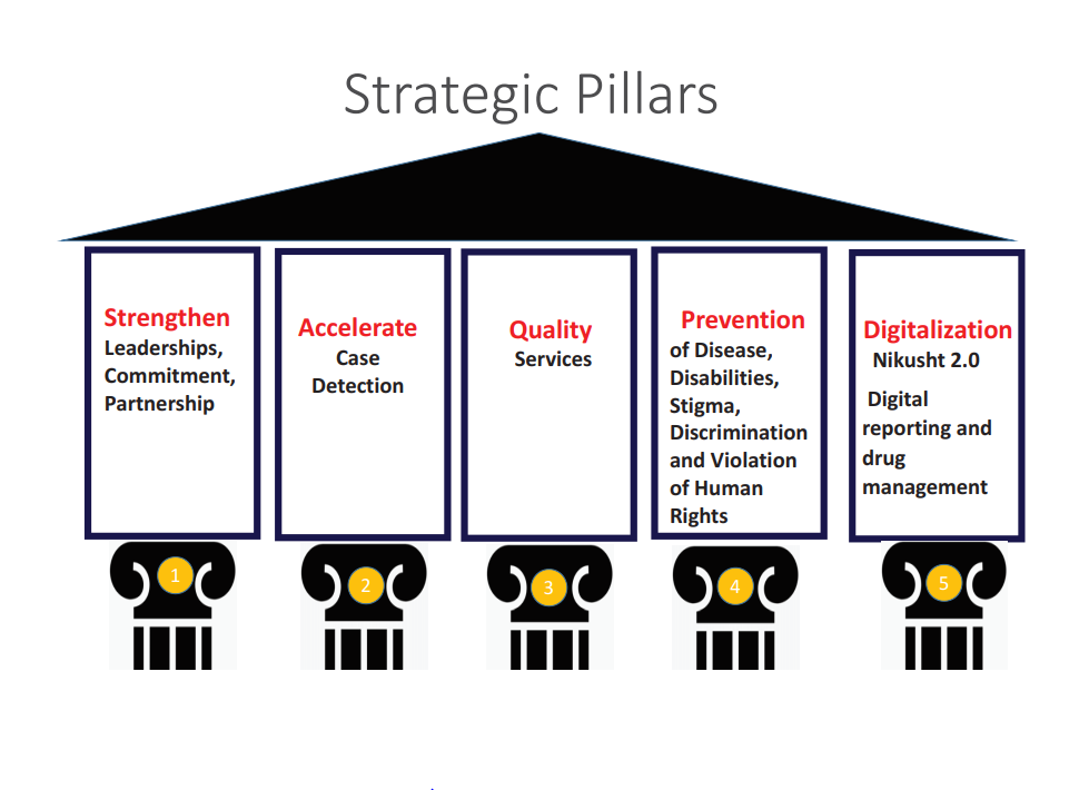 The National Strategic Plan and Roadmap for Leprosy 2023β2027 serves as Indiaβs forward looking framework to achieve interruption of leprosy transmission at the district level by 2027. Developed in consultation with national experts, WHO, and key stakeholders, the plan aligns with the WHO Global Leprosy Strategy 2021β2030 and reflects Indiaβs commitment to the Sustainable Development Goals (SDGs). The NSP promotes a patient-centric, rights-based approach to leprosy control and elimination. It is anchored on five strategic pillars: